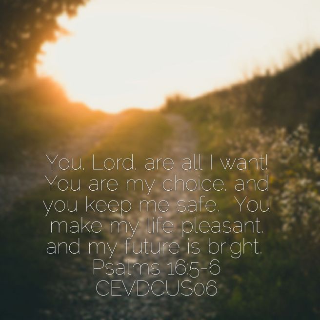 You, Lord, are all I want! You are my choice, and you keep me safe. You make my life pleasant, and my future is bright.